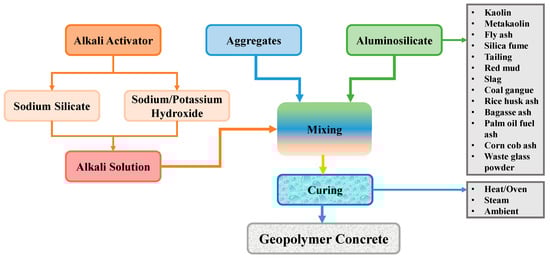 A geopolymer is actually a type of new binder that was created to be utilized in the concrete manufacturing process in place of OPC [19,20,21,22]. The purpose is to create an OPC-free, environmentally friendly, and sustainable building material. As industry and population growth continue to expand, a substantial number of various types of waste materials are created and disposed of in landfills. These waste materials include rice husk ash, waste glass powder, ground granulated glass furnace slag, silica fume and fly ash, etc. Because these waste materials are pollution sources, dumping them in landfills is hazardous to the ecosystem [23,24,25,26,27,28]. As geopolymer concrete (GPC) demands raw elements with more aluminosilicate levels and are available in the waste materials, recycling this type of materials to manufacture GPC will decrease environmental pollution [29,30,31]. The process of GPC production has been depicted in Figure 1, indicating the various types of ingredients and curing regimes used to produce GPC. The utilization of these types of waste materials will benefit both the environmental conditions and the economy, as shown in Figure 2, because these wastes are plentiful, and the necessity for inexpensive housing will grow as the population grows [32,33]. Globally, GPC is gaining popularity in the field of research, and it may finally become the best green building material [34,35,36]. Nevertheless, GPC has the potential to significantly contribute to the long-term survival of both CBCC technology and the building industry.
