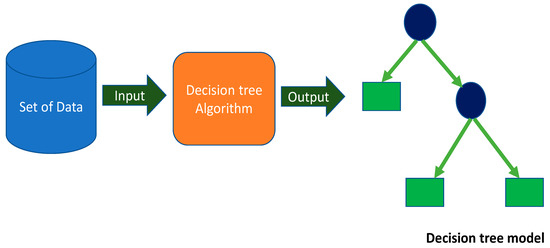 The DT method is a family member of the supervised learning algorithm. In addition to solving regression-type problems, it can also solve classification problems. The aim is to build a model that accurately forecasts the value of a target variable by inferring basic decision rules from the dataset. The purpose also includes generating a training model capable of anticipating the class or value of a target variable by inferring basic decision rules from prior data (training data). In decision trees, the process starts by forecasting a class label for a record at the tree’s root. The result of the root attribute is compared to those of the record’s attribute. It adopts the branch corresponding to that value and moves to the next node based on the relevant comparison. The detailed process of modeling with DT can be seen in Figure 5.