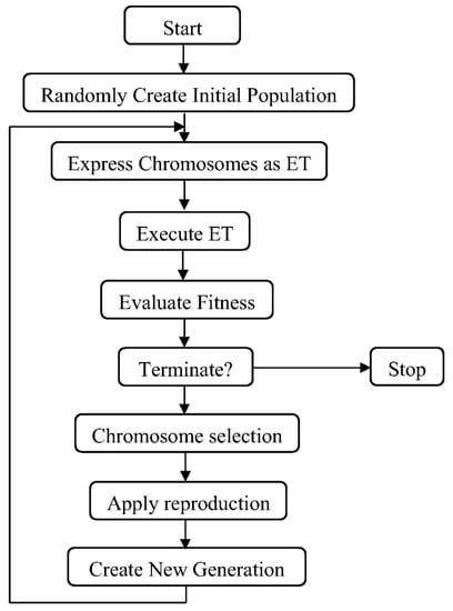Ferreira [53] invented GEP as a subfield of genetic programming. It is composed of five distinct elements, including fitness function, terminal set, function set, terminal condition, and control parameters. The GEP approach uses a fixed-length role string to acquire the solution, whereas the genetic programming technique utilizes a parse tree structure that can change in length during the course of computer programming. The GEP makes it exceedingly simple to create genetic variation because of the chromosomal level’s genetic mechanism. Additionally, because GEP is multi-genic, it enables the building of complicated and nonlinear programs comprising several subprograms. Figure 6 illustrates the GEP algorithm schematically. The process begins by randomly generating a chromosome of stable length for each growing program. Consequently, the chromosomes are confirmed, and each individual’s fitness is appraised. After that, individuals are picked for reproduction on the basis of their fitness findings. The process is repeated with each new individual until a solution is discovered. This method provides a transition in the population by executing genetic processes on the specified program, such as rotation, mutation, and crossover [54]. GEP is a transforming process for the creation of computer modules and programs. As with chromosomes, these programs often have a tree formation that can change dimensions (size/shape). Therefore, GEP can be significantly more effective than adaptive techniques as a genotype–phenotypic system. Karva is GEP’s programming language, and it is similar to the LISP languages. GEP provides a number of advantages over other standard regression techniques, which generate functions first and then evaluate them. However, GEP makes no provision for predefined functions.