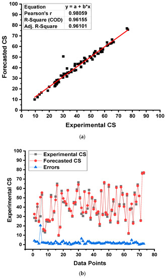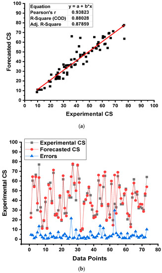 A comparable depiction of the outcomes of the RF model has been presented in Figure 12. An R2 value of 0.95 in Figure 12a shows a comparable performance of the RF model to the BR model. The dispersion of experimental CS results, forecasted results, and differences of those for the RF model are shown in Figure 12b. The minimum, average, and higher error values were found to be 0.40, 2.59, and 13.42 MPa, respectively. Error-values dispersal was found as 23.29% less than 1 MPa and 50.68% between 1 and 3 MPa, and only 26.03% surpassed 3 MPa. This distribution shows the RF model’s better predictive accuracy. Hence, it can be concluded that the ensembled SML techniques had greater accuracy than the individual SML techniques.