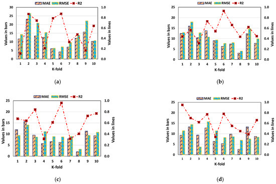 K-fold cross-validation statistical representation: (a) decision tree; (b) gene expression programming; (c) bagging regressor; and (d) random forest.
