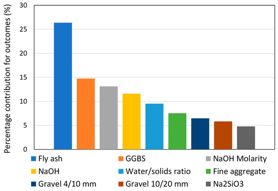 This assessment intends to ascertain the impact of input variables on the CS forecasting of GPC. The input variables significantly affect the expected outcome [59]. The impact of each input on the CS estimate of GPC is seen in Figure 15. The investigation found that fly ash was the most important element with a contribution of 26.4%, followed by GGBS with a contribution of 14.7% and NaOH molarity with a contribution of 13.1%. The other parameters contributed the least to the prediction of concrete’s strength, with NaOH having 11.6%, water/solids ratio 9.5%, fine aggregate 7.5%, gravel 4/10 mm 6.5%, gravel 10/20 mm 5.8%, and Na2SiO3 4.8% contribution. Equations (2) and (3) were used to determine the effect of each input variable on the model’s output.