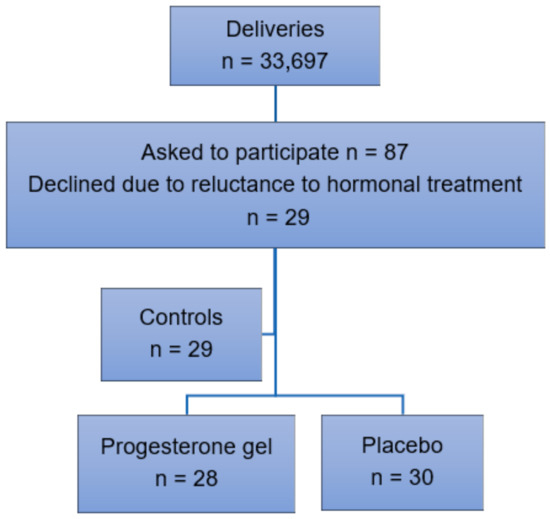 We evaluated the effect of vaginal progesterone gel (n = 28) compared to placebo (n = 30) in preventing PTB among women with early PTL, see Figure 1. In the years 2009–18, n = 33,697 childbirths took place at our hospital. In total, n = 87 women were asked to participate in the trial. Of these, n = 29 women declined due to reluctance to hormonal treatment during pregnancy. This group of women with identical inclusion and exclusion criteria received standard intravenous tocolytics alone and served as a control group.