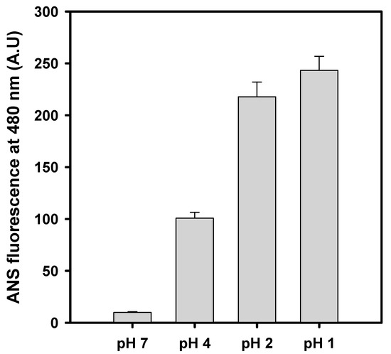 The partially unfolded states or molten globule states of proteins are frequently characterized by measuring changes in ANS fluorescence. ANS has a significantly lower binding affinity with native and fully denatured proteins because the appropriate hydrophobic patches are unavailable for ANS binding. However, the partially unfolded or molten globule state of the protein exposes hydrophobic patches and provides a suitable environment for ANS binding and producing high ANS fluorescence intensity [41,42]. The exposure of hydrophobicity of alpha-crystallin (0.2 mg mL−1) at four different pH values (1.0, 2.0, 4.0, and 7.5, respectively) was measured at room temperature (Figure 3). Alpha-crystallin in the native state (pH 7.5) exhibited a poor ANS binding signal, indicating that alpha-crystallin in the native state has low surface hydrophobicity (Figure 3). This finding indicates that alpha-crystallin is well-folded. However, at pH 4.0, 2.0, and 1.0, respectively, the fluorescence intensity of ANS increased in response to a change in pH, confirming that the surface hydrophobicity of alpha-crystallin was increased with respect to the change in pH. The increased surface hydrophobicity with respect to pH resulted from the formation of the molten, globule-like state of alpha-crystallin.