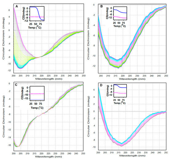 The spectroscopic and thermodynamic properties of alpha-crystallin at four different pH values (1.0, 2.0, 4.0, and 7.5) were examined by DMS [43]. Alpha-crystallin revealed distinct secondary and tertiary structures at pH 1.0, 2.0, 4.0, and 7.5, respectively. Therefore, we selected these pH values to evaluate the thermodynamic and folding characteristics of alpha-crystallin. Alpha-crystallin samples (0.2 mg mL−1) at pH 1.0, 2.0, 4.0, and 7.5, respectively, were heat-stressed from 20 °C to 94 °C at a rate of 1 °C/min under identical conditions. The far-UV CD spectra (200 to 250 nm) were recorded as a function of temperature. Figure 4A–D shows the changes in the secondary structure conformation of alpha-crystallin at different temperatures and pH values. Alpha-crystallin in the native state (pH 7.5 and room temperature) exhibited a single minimum at 217 nm, representing a characteristic feature of a beta-sheeted rich protein (Figure 4A). The peaks at 217 nm were unchanged during heat stress (20–94 °C), indicating that the alpha-crystallin beta-sheeted core structure was preserved during heat stress. Moreover, the ellipticity at 217 nm was unchanged between 20 °C and 50 °C, indicating that the secondary structure was intact over this temperature range. Interestingly, above 50 °C, a sharp increase in the ellipticity minima at 203 nm was observed without altering the 217 nm ellipticity, indicating the formation of a random coil-like structure while maintaining the original beta-sheeted structure (Figure 4A, inset).