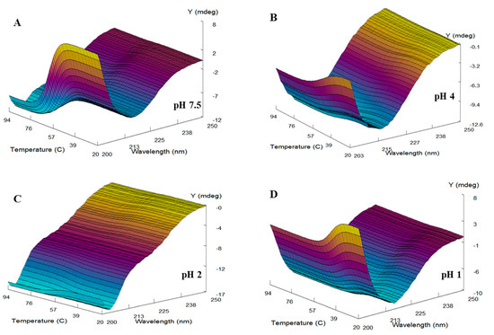 Calculated temperature, wavelength, and far-UV CD signal of alpha-crystallin at different pHs. The three-dimensional model of alpha-crystallin at pH 7.5 (A), 4.0 (B), 2.0 (C), and 1.0 (D), respectively, was calculated using Global 3 software and the far-UV CD signal obtained during temperature ramping (1 °C min−1).