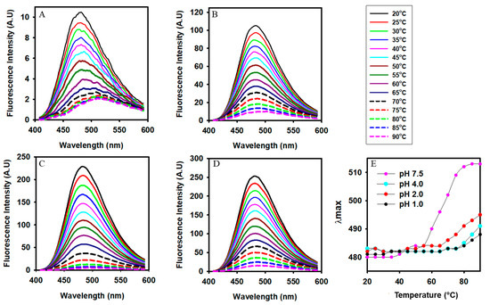 Differential scanning fluorometry of alpha-crystallin using an extrinsic fluorophore at four different pH values. ANS fluorescence was monitored by incubating alpha-crystallin at pH 7.5, 4.0, 2.0, and 1.0, respectively, from 20 °C to 90 °C by stepwise temperature increases of 5 °C. (A) pH 7.5, (B) pH 4.0, (C) pH 2.0, and (D) pH 1.0. (E) Effect of temperature on the λmax of alpha-crystallin at pH 7.5, 4.0, 2.0, and 1.0, respectively.