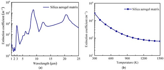 Radiative properties of silica aerogel matrix with a density of 130 kg/m3. (a) Extinction coefficient vs. wavelength, and (b) Rosseland mean extinction coefficient vs. temperature.