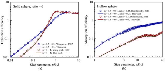 Comparison of radiative properties of solid and hollow spheres with those from the literature [21,22]. (a) Extinction efficiency of a solid sphere vs. size parameter, and (b) Absorption efficiency of a hollow sphere vs. size parameter. Adapted with permission from Ref. [21], 1983, Elsevier, and Ref. [22], 2011, Begell House, Inc.