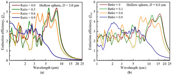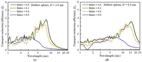 Figure 3a,b show the variation of the extinction efficiency of a hollow opacifier as a function of wavelength, in which (solid), , and , respectively. The shell thickness equaled () and decreased with the increase of . Due to the decrease of the volumetric equivalent refractive index of the hollow opacifier, the peak values of extinction efficiency decreased, and the peak positions moved towards the short-wavelength direction with the decrease of shell thickness. For example, when , the peak positions of extinction efficiency moved from 5–10 μm to 2–4 μm, and the average peak value of extinction efficiency decreases from ~5 to ~3 as increases from 0 to 0.9. A similar trend was also observed when , as shown in Figure 3b. The above trends agree with the results from [23]. Comparing Figure 3a and Figure 3b shows that the peak positions of extinction efficiency move to the long-wavelength direction as the outer diameter of the opacifier increases. We note that the extinction efficiency does not consider anisotropic scattering, which may overestimate the extinction effect of the doped hollow opacifiers. Figure 3c,d show the variation of the transport extinction efficiency () of a hollow opacifier that excludes forward scattering as a function of wavelength. Here, the transport efficiency is expressed as: