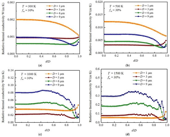 Figure 4 depicts the variation of the radiative thermal conductivity of silica aerogel doped with hollow opacifiers with different outer diameters and mass fraction of 30% at various temperatures (300 K, 500 K, 1000 K, and 1500 K) as a function of shell thickness. According to Wien’s displacement law [24], the peak wavelength of thermal radiation shifts towards the short-wavelength direction with increasing temperature. Thus, we observed that the optimal diameter of the solid opacifiers () decreased gradually when the temperature increased from 300 K to 1500 K (Figure 4a–d). For example, as shown in Figure 4a, the silica aerogel doped with 6 µm diameter solid opacifiers demonstrated the lowest radiative thermal conductivity. As the temperature increased to 1500 K (Figure 4d), the lowest radiative thermal conductivity was achieved by the silica aerogel composite consisting of 1 µm diameter solid opacifiers. However, the above trend may not be suitable for hollow opacifiers due to the shift of the peak values of the transport extinction efficiency (Figure 3). The hollow opacifier with a large diameter and small shell thickness can achieve similar or even lower radiative thermal conductivity comparing to small-sized opacifier at high temperature. For example, when , the radiative thermal conductivity of silica aerogel doped with hollow opacifiers with an outer diameter of 9 μm was lower than that of silica aerogel doped solid opacifiers with a diameter of 1 µm. The above results indicate that the hollow opacifiers with a large outer diameter and thin shell thickness are also suitable for reducing the radiative thermal conductivity of silica aerogel at high temperature. In addition, we noticed that the variation trends of radiative thermal conductivity of silica aerogel composites doped with hollow opacifiers with respect to shell thickness are closely related to the outer diameter of opacifiers and the working temperature. For example, the radiative thermal conductivity of silica aerogel composites doped with hollow opacifiers with an outer diameter of 1 µm decreased at 300 K and 500 K and increased at 1000 K and 1500 K with a decrease of shell thickness (or increase of ). The radiative thermal conductivity of silica aerogel composites doped with hollow opacifiers with an outer diameter of 9 µm decreases then increases with decreasing shell thickness (or increasing ) at 300 K and 500 K. Therefore, to achieve minimum radiative thermal conductivity at a specific working temperature, detailed calculations are needed for the selection of hollow opacifiers with an optimal outer diameter and shell thickness.