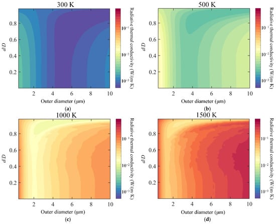 Figure 5 shows the variation of the radiative thermal conductivity of silica aerogel composite as a function of both shell thickness and outer diameter of hollow opacifiers at different temperatures, in which the mass fraction of the doped hollow opacifier is 30%. As shown in Figure 5a, the optimal diameter of solid opacifiers is 4–6 µm at 300 K. Similar radiative thermal conductivity can be achieved when using hollow opacifiers with an outer diameter of 6–10 um and . When the temperature increased to 500 K (Figure 5b), the optimal diameter of solid opacifiers was reduced to 3–4.5 µm. More importantly, we see that that silica aerogel doped with hollow structures with an outer diameter of 4–10 µm and can achieve lower radiative thermal conductivity. Similar results can also be found in Figure 5c,d, where the temperatures are 1000 K and 1500 K, respectively. In addition, we noticed that the optimal shell thickness of the hollow opacifiers becomes thinner with the increase of temperature, which means that fewer hollow structures can achieve a higher extinction coefficient than solid ones. For example, at 500 K (Figure 5b), the optimal is >0.7, and the optimal needs to be >0.8 when the temperature is 1000 K (Figure 5c). This can be attributed to the shift in the peak positions of transport extinction efficiency observed in Figure 3. Overall, Figure 5a–d indicate that doping of hollow opacifiers allow the silica aerogel to achieve lower radiative thermal conductivity compared to that using solid opacifiers, and the shell thickness reduces as outer diameter increases.
