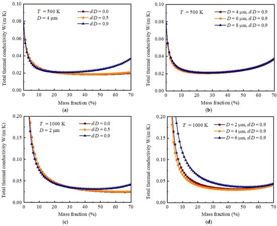 Figure 6a depicts the variation of the total thermal conductivity of silica aerogel doped with hollow opacifiers as a function of the mass fraction at 500 K. Due to the competition between the decreased radiative thermal conductivity and increased conductive thermal conductivity, when and , we see that the total thermal conductivity decreases as the mass fraction of the doped solid opacifiers increases to around 40%, then increases as the mass fraction continues to increase. A similar trend is also observed when and . In addition, we see that the total thermal conductivity of the silica aerogel doped with hollow opacifiers with an outer diameter of 4 µm and of 0.9 is lower than that of silica aerogel doped with solid opacifiers with the optimal diameter (i.e., 4 µm, Figure 5b) when the mass fraction of the doped opacifiers is <20%. According to Figure 6b, a lower total thermal conductivity can be achieved by doping silica aerogel with hollow opacifiers with an outer diameter of 6 µm and of 0.9 when the mass fraction of the doped opacifiers is <20%. Figure 6c shows the variation of the total thermal conductivity of silica aerogel doped with hollow opacifiers as a function of the mass fraction at 1000 K. Due to the improved radiative thermal conductivity at higher temperature, the optimized mass fraction of doped solid opacifiers at 1000 K is around 60%, higher than at 500 K. We also see that the total thermal conductivity of the silica aerogel doped with hollow opacifiers with an outer diameter of 2 µm (or 4 µm) and a of 0.9 is lower than that of silica aerogel doped with solid opacifiers with the optimal diameter (i.e., 2 µm, Figure 5c) when the mass fraction of the doped opacifiers is <30% (Figure 5c,d). These findings suggest that lower density can be obtained with hollow structures when the target thermal conductivity is the same and better insulation performance properties can be obtained with hollow structures when the mass fraction of doping is the same.