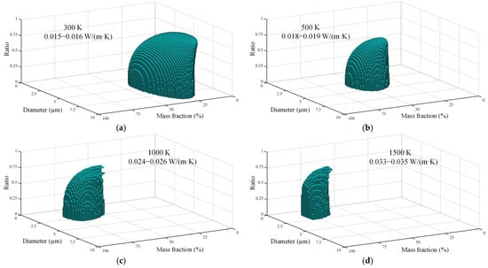 Figure 7a–d depict the optimized outer diameters, shell thicknesses, and mass fractions of hollow spheres doped into silica aerogel at different temperatures. The selected ranges of outer diameter, , and mass fractions were 0.5–10 µm, 0–0.9, and 0–75%, respectively. Similarly to Figure 5, we observe that the optimal outer diameter decreases, and the optimal mass fraction increases with the increase of temperature. More importantly, we confirm that minimal thermal conductivity can be achieved by using hollow opacifiers with lower mass fraction than of solid opacifiers. For example, when the temperature is 1000 K (Figure 7c), adopting hollow opacifiers (2.1 µm, = 0.63) with a mass fraction of 50% can achieve the same thermal insulation performance as using the solid opacifiers with a diameter of 2 µm and mass fraction of 78%. Additionally, it can be seen that that the number of optimal combinations decreases as temperature increases.