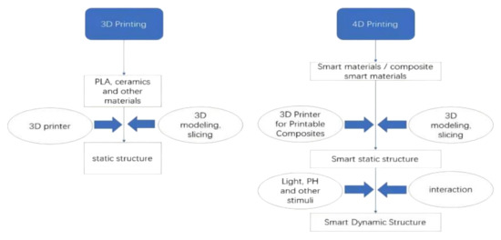 Three-dimensional (3D) printing was originally known as rapid prototyping technology when it was first introduced in the 1980s. Owing to its low cost, fast molding speed, and ability to achieve customization, 3D printing has been widely promoted and applied in the fields of electronics [1], energy devices [2], medicine [3], biotechnology [4], optical [5], structural industries [6], automotive and aerospace [7], and other fields. Tibbits [8] proposed the concept of “four-dimensional (4D) printing” at the 2013 TED conference in Long Beach, California, and displayed a wire-like object that could automatically form an “MIT” shape in water. The concept of a fourth dimension, originally termed “3D printing + time”, has been further developed in recent years, allowing for modification of the shape, properties, or function of a 4D printed structure by external environmental stimuli, including water [9], light [10], heat [11,12], electric current [13], magnetic field [14], and pH [15,16]. Figure 1 shows the difference between 3D and 4D printing.