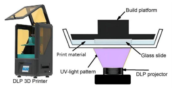 SLA stands for stereolithography apparatus or light-cured stereoscopic molding. The working principle of SLA is to complete a layer of model processing using a specific wavelength and intensity of laser focused on the surface of the light-curing material from point to line, from the line to the surface of the solidification sequence. Subsequently, the table is lifted vertically to gain a level of height, and the aforementioned steps are subsequently followed to continue to cure the next layer. Using this method, the layers are processed layer by layer to form a 3D solid [42]. A conventional SLA uses a laser beam as its light source. However, instead of a laser beam, DLP uses a projector as its light source. Because the projection of the digital image allows the entire pattern of each layer to be cured in a single exposure, the DLP process prints and produces much faster than conventional SLA technology. Figure 3 shows the principle of DLP.