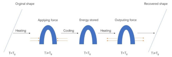 The printing of smart materials that respond to environmental stimuli is known as 4D printing [65]. What distinguishes 3D and 4D printing is the choice of printing materials [66]. Compared to 3D-printed structures, 4D-printed structures are self-assembling, adaptive, and self-healing, owing to the use of smart materials. To date, there are three types of materials to realize 4D printing, including (a) shape-memory polymers (SMPs), (b) hydrogels, and (c) other extracted biomaterials possessing the shape-memory effect (SME). Shape-memory materials deform into a temporary shape when exposed to an environmental stimulus and return to the initial shape when given another suitable environmental stimulus. The thermal response deformation process of shape-memory polymers is shown in Figure 4. The whole procedure can be summarized as follows. First, the shape is formed by heating. The SMP is heated above glass transition temperature (Tg) and subsequently shaped into a preconceived temporary shape by applying an external force. Subsequently, the SMP is cooled down and shaped. The SMP is slowly cooled to below Tg while keeping the external force constant, after which it is fixed in the temporary shape. Finally, the SMP is warmed up and reshaped. The temporary SMP structure is warmed up again to over Tg and spontaneously transforms from the temporary shape to the original shape. At this point, the deformation process is completed. If a material is shape-changing, its form immediately changes after being excited by certain environmental conditions, and it immediately reverts to its previous form once the excitation is stopped.