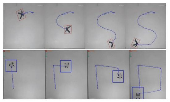 Magnetic hydrogels are obtained by adding magnetic particles to a prefabricated gel or solution to form a complex driven by a programmed and external magnetic field. Owing to the dispersion of magnetic particles, the medium of the prefabricated solution must be viscous to prevent particle agglomeration. Chen et al. proposed an efficient internal support-material carbomer for ink direct 3D printing of hydrogels. As well as providing significant printing properties for hydrogels, carbomer also improves the mechanical properties of hydrogels. Carbomer-prepared hydrogel inks with high yield stress and high viscosity allow for the magnetic nanoparticles to be uniformly dispersed in the hydrogel, offering the possibility of 3D printing magnetic hydrogels. Using such a method, Chen et al. 3D-printed an octopus with tentacles made of crosslinked polyacrylamide (PAAm) and magnetic Fe3O4 nanoparticles. Su [81] designed a soft cross-shaped thin-film microrobot and a crawling quadruped robot made of an elastomeric material embedded with magnetic particles (NdFeB) as a smart magnetic composite. When the microrobot was magnetized in a specific hemispheric manner and driven by applying different magnetic fields, the generation of magnetic moments allow the robot to produce predictable deformations. The programmable, deformable cross-film robot had two modes: shovel mode and jellyfish mode. Both motion modes were modeled, velocity-analyzed, trajectory-controlled, and load-capacity-tested. Furthermore, a microbead handling experimental scenario was set up to demonstrate the good handling capabilities and maneuverability of the soft robot driven by a programmed magnetic field, which was able to respond quickly to stimuli by moving itself. The trajectories of the two robots under magnetic field control are shown in Figure 5.
