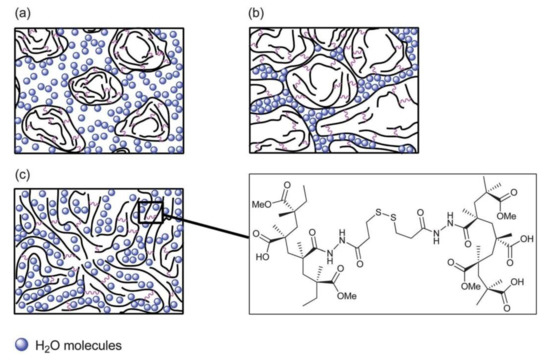 (a) Representation of polystyrene-methacrylic acid (PMMA-MAA)- and phenethylamine-methacrylic acid (PEA-MAA)-crosslinked particles in a non-swollen state at pH < 6.5–7.0; (b) PMMA-MAA- and PEA-MAA-crosslinked particles in the swollen state at physiological pH; (c) gelation of PMMA-MAA/DTP-crosslinked particles at a pH of 6.5–7.0. Reprinted with permission from Ref. [87]. Copyright 2013, Halacheva, S.S.