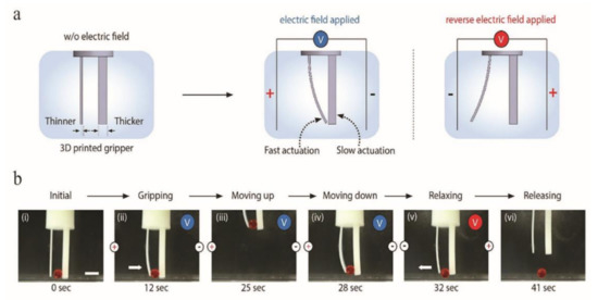 Electrically stimulated hydrogels are composed of polyelectrolyte substances [88]. When an electric field is applied to such hydrogels in an electrolyte solution, the hydrogel changes volume or shape. Electrical energy is converted to mechanical energy by such a change in shape or volume. Electrically stimulated hydrogels respond to an external electric field, and the expansion difference in the structure is triggered by the application of the external electric field. Some devices can precisely control the duration of the electrical pulse and the magnitude of the current. Moreover, such systems have the advantage of having a homogeneous chemical composition and crosslinkage in the initial electroactive hydrogel, which simplifies printing [66,89].