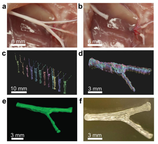 Pi et al. [96] used sodium alginate, methacrylate-anhydride gelatin (GelMA), and an eight-arm polyethylene glycol acrylate (PEGOA) composite hydrogel with a tri-quaternary alcohol nucleus to prepare biolinks loaded with vascular cells (human umbilical vein epithelial cells (HUVECs) and human smooth muscle cells (hSMCs)), urothelial cells (human urinary tract epithelial cells (HUCs)), and human bladder smooth muscle cells (HBdSMCs). The cells were used to print vascular and urethral complex tubular tissues, as shown in Figure 8a,b. Using this method, Pi et al. [96] also successfully printed vascular and urethral tissue scaffolds that could be perfused with fluid and nutrients to promote the growth and proliferation of loaded cells, as shown in Figure 8c.