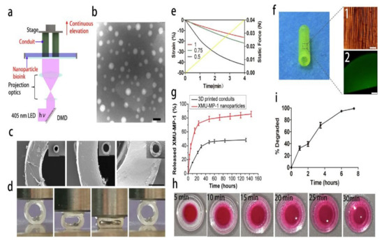 - Tao, J.; Zhang, J.; Du, T.; Xu, X.; Deng, X.; Chen, S.; Wei, Y. Rapid 3D printing of functional nanoparticle-enhanced conduits for effective nerve repair. Acta Biomater. 2019, 90, 49–59. [Google Scholar] [CrossRef]