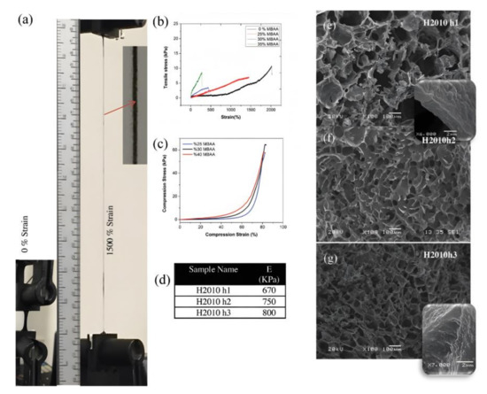 Halacheva et al. [87] designed pH-responsive hydrogels using crosslinked particles with high porosity, elasticity, and ductility of acrylic acid, as shown in Figure 6. The group varied the initial pH of the prerequisite solution to give the resulting hydrogels high mechanical properties, and other studies have shown that changes in the initial pH of the prerequisite solution affects the swelling properties of hydrogels, as well as the gelling kinetics.