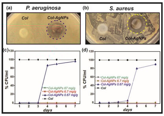 Antezana et al. [] studied the antibacterial activity and biocompatibility of hydrogels based on collagen and spherical AgNPs ranging from 10 to 15 nm. The growth inhibiting effect of the hydrogels on the S. aureus and P. aeruginosa was established, as evidenced by the presence of the zones of inhibition vs. the nanoparticle-free hydrogel (Figure 1). The CFU mL−1 values for the S. aureus and P. aeruginosa bacteria significantly decreased within 7 days for the hydrogels containing 6.7 mg g−1 and 67 mg g−1 of AgNPs. However, for the hydrogels with the lower AgNPs content (0.67 mg g−1) the decrease in CFU mL−1 was observed only for 3 days followed by a later rise. Unfortunately, the authors did not provide an explanation for this fact.