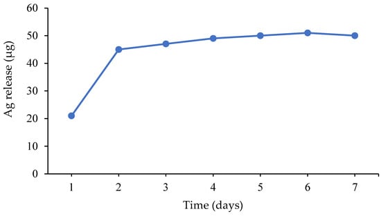 Since gelatin yields high-swelling gels it can increase the same parameter for other polymers as well. Thus, Sethi et al. [] synthesized a hybrid hydrogel containing spherical (particle size 4–19 nm) and quasispherical (particle size 4–58 nm) AgNPs based on starch and gelatin. N,N’–methylenebisacrylamide was used for chemical crosslinking of the polymers, whereas for physical crosslinking polyacrylic acid was grafted to starch and gelatin. The maximum swelling degree in blood, water, 0.9% aqueous solutions of MgCl2 and NaCl for the hybrid gel were by 12–27% higher compared to that of the starch-based gel and the compressive modulus grew by 201%. The hybrid hydrogel possessed sufficient porosity, antibacterial activity against E. coli and S. aureus and was non-cytotoxic towards the human skin fibroblasts (cell viability 89%). The release of silver into the phosphate-buffered solution was fast within 2 days, whereas later it became nearly stable (Figure 2). The amount of the released silver varied in the range of 21–51 mcg per 0.5 g of gel, which is acceptable for use in the wound-repair application.