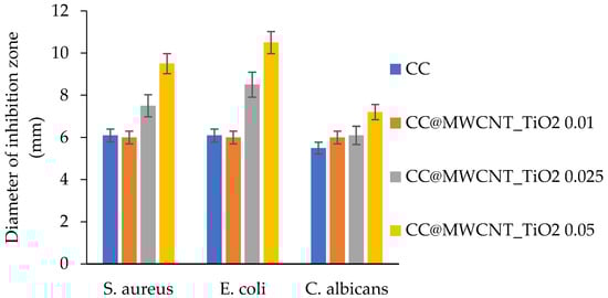 The antimicrobial activity of the films against the S. aureus, E. coli bacteria and the C. Albicans fungi. CC—cellulose acetate-collagen, MWCNT—multi-walled carbon nanotubes, 0.01, 0.025, 0.05—the weight (g) of MWCNT_TiO2 added to the solution of cellulose acetate and collagen in acetic acid and water.