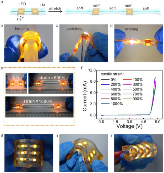 Conformal packaging of “island–bridge” stretchable electronics. (a) Scheme of the soft–stiff–soft–stiff–soft “island–bridge” configuration enabled by Fe (III) stiffening and stretching of the soft (not iron (III)-treated) component. (b–d) Photographs showing the resistance of the “island–bridge” circuit against various mechanical stresses, such as (b) bending, (c) punching, and (d) twisting. (e) The “island–bridge” circuit before and during stretching (500% and 1000% tensile strain). (f) I–V characteristic curves of the “island–bridge” circuits at different tensile strains. (g–i) Array of LEDs in a flexible circuit at various mechanical deformations, which are locally stiffened with Fe (III) at the LED locations.