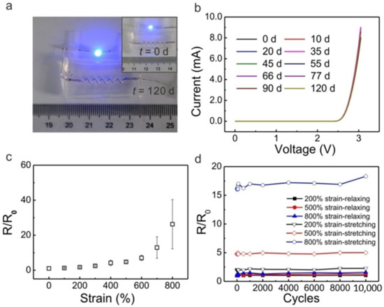 Durability of liquid-metal organohydrogel circuits and their electrical performance. (a) Photographs of the as-prepared (inset) and aged (120 days, 50% humidity) organohydrogel circuit. (b) Characteristic I–V curve of the as-prepared organohydrogel circuit and after storage for up to 120 days. (c) Ratio of the resistance (R/R0), where R is the resistance at applied tensile strain and R0 denotes for the resistance without tensile strain. (d) Fatigue test: ratio of the resistance of the circuit from (a) during stretching and relaxing for up to 10,000 cycles.