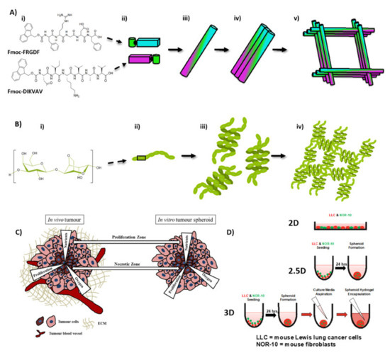 A promising class of SAP hydrogels is Fluorenylmethyloxycarbonyl-SAPs (Fmoc-SAPs). Fmoc-SAPs are SAP sequences capped with an Fmoc aromatic group at the N-terminal. This Fmoc group drives the self-assembly process through π-π stacking between aromatic groups, followed by formation of nanofibres through non-covalent interactions. These assembly processes result in nanofibres with epitope bioactivity decorating their external surface [30,31]. The decorated nanofibres intertwine longitudinally to form an entangled matrix hydrogel with similar mechanical properties, physical properties, and epitope presentation to the in vivo ECM (Figure 2) [30]. Fmoc-SAPs are advantageous because they are easily synthesised, biocompatible, and have the capacity to be functionalised with specific bioactive peptide sequences at high density on the surface of the nanofibres [32]. Utilising these materials, we present an enhanced in vitro 3D lung tumour model, which we demonstrate to have significant relevance to the in vivo TME. Multicellular spheroids of murine Lewis lung cancer cells (LLC) and murine fibroblast cells (NOR-10, derived from skeletal muscle) were encapsulated within self-assembled pro-adhesive peptide sequences from ECM components. Peptide sequences include isoleucine–lysine-valine–alanine–valine (IKVAV) derived from laminin, a component found in ECM basement membrane and arginine–lycine–aspartate (RGD) derived from fibronectins, components of connective tissue [33]. These peptide sequences have been used widely to engineer scaffolds for 3D cell culture systems, and we have previously shown that IKVAV-peptide sequences induce cellular adhesion and tubule formation [34] and RGD-peptide sequences enhance interaction between integrins on the cells and biomaterial [35,36]. In order to compare our nanostructured hydrogel to a control with broadly similar bulk properties but lacking the programmed chemical richness of our peptide system, we compared it to a commonly used agarose-based hydrogel.