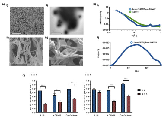 As expected, the microscopy showed that the Fmoc-SAP produced a nanofibrous morphology that underpinned a microscale porous scaffold as previously reported (Figure 2Ai,iii). Fmoc-FRGDF/Fmoc-DIKVAV hydrogels formed a dense network of fibrous structures that ranged in size, with the larger fibers likely a result of fiber bundling, in accordance with previous findings [34]. The cylindrical nature of the fibres was confirmed by SAXS power law analysis (transition from q−4 at mid q-range trending to q−1 at low q-range) and the average fibre radius (7.3 nm) was determined by Indirect Fourier Transform (IFT) of the SAXS data [38] By microscopy, the agarose control presented a similar microstructure to the Fmoc-SAP hydrogel; however, it showed no such nanofibrillar organisation and thus was not suited to the SAXS IFT analysis (Figure 2Aii,iv). However a power law analysis of the scattering at low q revealed a branched polymer network type conformation (Power = 2.50, Figure S1) [39]. Both hydrogels demonstrated a highly dense network of high porosity, but in the agarose system, the network appears more chaotic with thicker bundles and large clump-like intersections evident. However, analysis of mesh size by SAXS power law crossover revealed a more porous nanoscale network in the Fmoc-SAP gel (10.2 nm vs. 19.4 nm for the agarose sample, Figure S1) [40]. Both structures have similar macroscopic properties and microscale structure but are underpinned with a different nanoscale and molecular structure, which makes agarose an ideal control for the 3D culture.