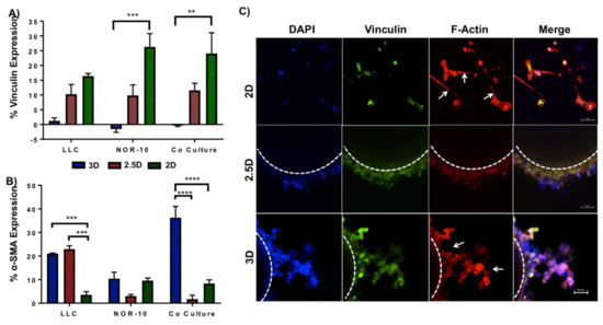 Vinculin is a cytoskeleton protein contributing to cell-cell adhesion through cadherin and cell-ECM connection through integrin receptors [46,47]. It is closely associated with a role in governing cell-matrix adhesion. It plays a critical role in regulating integrin clustering, and generates the forces required to attach the cells to the ECM. A significant reduction in vinculin levels eventually results in decreased cell adhesion and induction of motility, and it can be considered a mechanism for monitoring cancer cell invasion and metastasis [46,47]. The down-regulation of vinculin was reported in many invasive cancers including colorectal cancer, melanoma, vaginal and cervical carcinoma [47,48,49]. Therefore, to explore the functional association between cancer cell adhesion and ECM, vinculin expression in 3D mono- and co-culture spheroids was compared to 2.5D and 2D cell culture by flow cytometry (Figure 3A and Figure S2). Our results showed that at 72 h post culture, vinculin was significantly downregulated in 3D NOR-10 (0%) and co-culture (0%) spheroids compared to 2D cell cultures (26.3% and 24.1%, respectively) (NOR-10 p = 0.0004, co-culture p = 0.0019). In 2.5D spheroids, there was no significant difference in the percentage of cells expressing vinculin (10.3% LLC, 9.8% NOR-10 and 11.6% co-cultured spheroids) compared to 3D and 2D spheroids (ns = not significant, p ≥ 0.05).