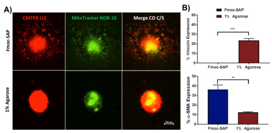The aim of study was also to demonstrate that any cellular response within the scaffold is due to the 3D scaffold’s ability to mimic the natural ECM environment via the presence of biological stimuli. To ensure that RGD- and IKVAV-functionalised Fmoc-SAP hydrogels facilitate the migration of cancer cells in co-cultured spheroids by integrin and cancer cell interaction, co-cultured spheroids were tracked. 1% agarose hydrogel provides structure and support to the spheroids; however, it lacks functionalization, and therefore, was again chosen as a control. LLC cells were loaded with the cell CMTPX Dye (Figure 4A, red) and NOR-10 cells were loaded with MitoTracker™ Green FM (Figure 4A, green), and were encapsulated within Fmoc-SAP functionalised hydrogel or 1% agarose hydrogel. After 72 h of incubation, the tracked spheroids were imaged under confocal microscope. Vinculin and α-SMA (Figure 4B) expressions were also measured in co-cultured spheroids encapsulated within both hydrogels by flow cytometry. Our results showed the enhanced motility of CMTPX-labelled LLC and MitoTracker-labelled NOR-10 co-cultured spheroids in Fmoc-SAP hydrogel, whereas spheroids stayed immobile within 1% agarose, lacking the nanofibrous RGD and IKVAV signals. Cancer cells’ motility within Fmoc-SAP hydrogel over non-functionalised 1% agarose was due to the loss of cell adhesion as the vinculin level was significantly downregulated (0%) compared to cells within 1% agarose (23.6%) (Figure 4B). The present findings are in agreement with a previous study that observed the inhibition of U373-MG human glioma spheroid cell migration within 1% agarose compared to collagen and composite collagen-agarose gels [59]. These results highlight the significance of using this model to replicate lung cancer cell adhesion and migration in vitro.