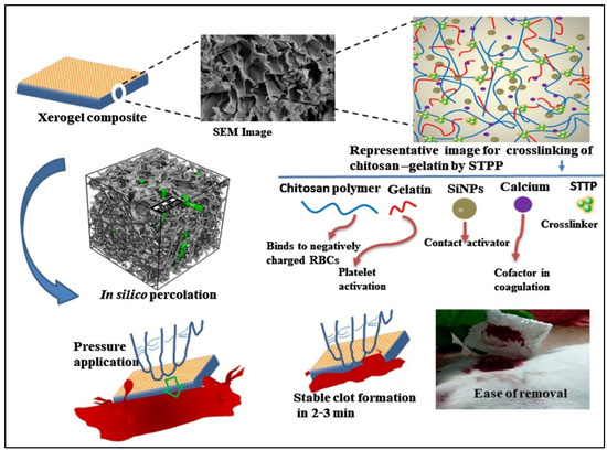 - Patil, G.; Torris, A.; Suresha, P.; Jadhav, S.; Badiger, M.V.; Ghormade, V. Design and synthesis of a new topical agent for halting blood loss rapidly: A multimodal chitosan-gelatin xerogel composite loaded with silica nanoparticles and calcium. Colloids Surf. B Biointerfaces 2021, 198, 111454. [Google Scholar] [CrossRef]