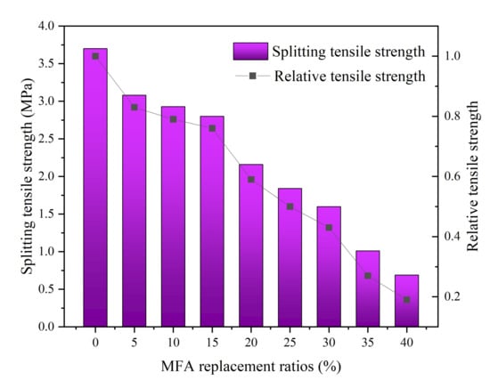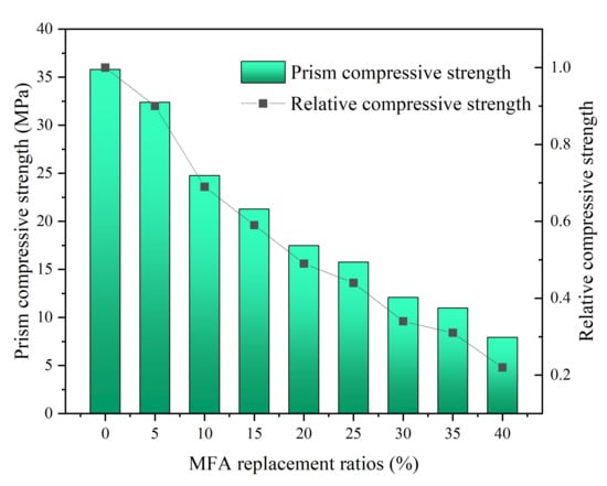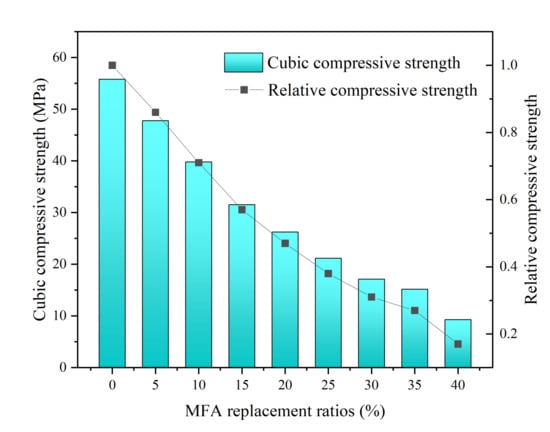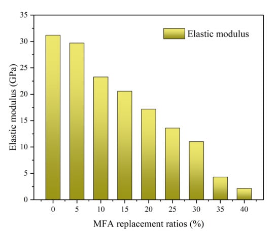 - The basic mechanical properties of MFA-GPC show a linear downward trend with the continuous increase of MFA replacement ratios. When the MFA replacement rate reaches 40%, the cubic compressive strength, splitting tensile strength, axial compressive strength and elastic modulus decrease to 83%, 81%, 78%, and 93%, respectively compared with the reference group.
