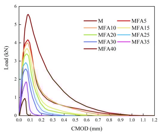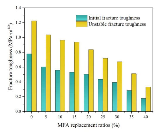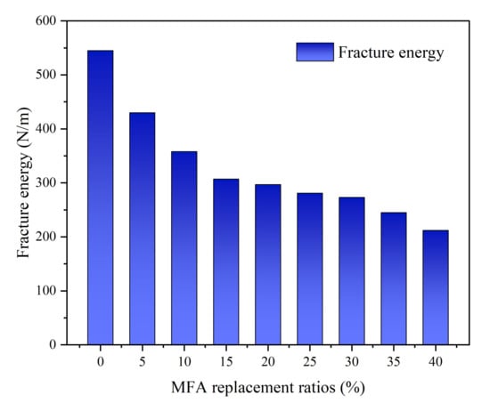 - The fracture properties of MFA-GPC gradually decrease with the increase of MFA replacement ratios. When the MFA replacement rate reaches 40%, the peak load, initiation fracture toughness, unstable fracture toughness and fracture energy are reduced by 83%, 77%, 73% and 61%, respectively, compared with the reference group.