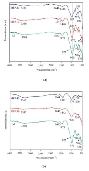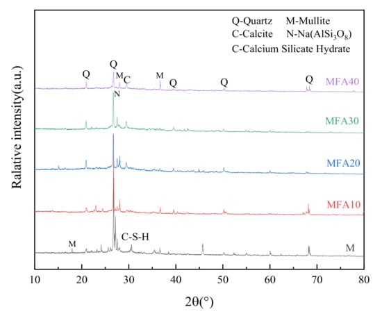 - The microstructure of MFA-GPC becomes porous and loose with the addition of MFA. With the increase of MFA substitution ratios, voids and cracks in the matrix structure further increase, which explains the difference of mechanical properties between MFA-GPC and GPC. XRD and FTIR results indicate that the main hydration products of MFA-GPC are amorphous aluminosilicate minerals gels. However, the aluminum silicate gel products in MFA-GPC gradually decrease, and the degree of carbonization gradually increases.