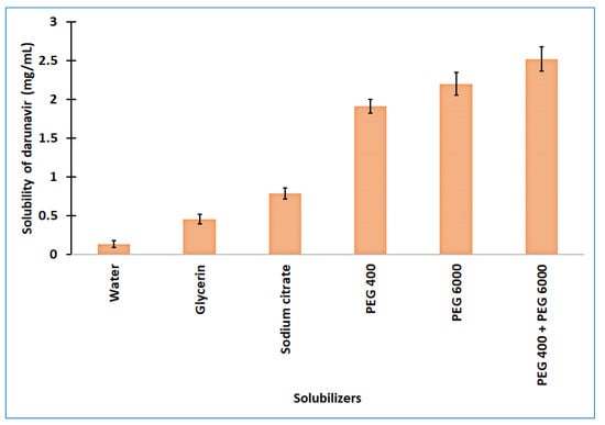 Solubility of darunavir in various solubilizers determined. The data presented are the average ± SD (n = 6). PEG: polyethylene glycol.