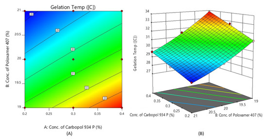 Contour plot (A) and 3D surface plot (B) show the effects of the concentrations of Carbopol 934P and Poloxamer 407 on gelation temperature.