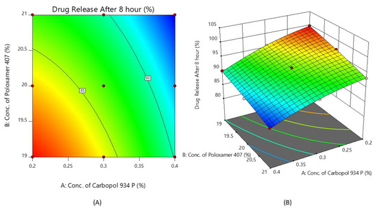 Contour plot (A) and 3D surface plot (B) show the effects of the concentrations of Carbopol 934P and Poloxamer 407 on drug release after 8 h.