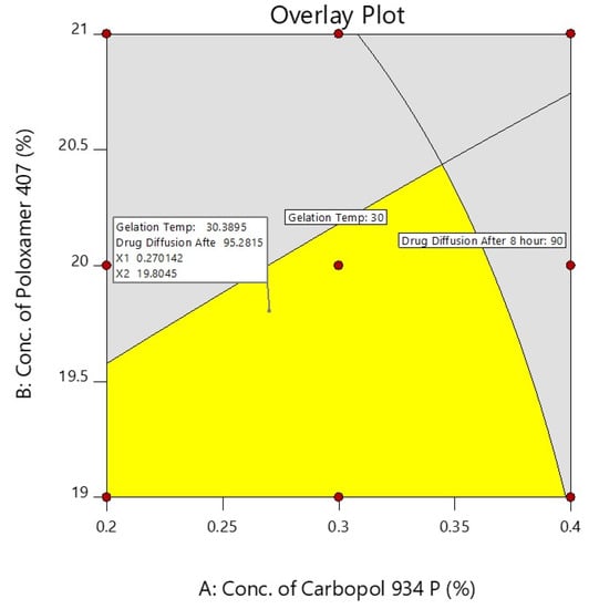 The differences between the predicted and experiential values were insignificant. The selected experimental model’s validity was confirmed by the good agreement between the predicted and experimental values. On the basis of the design and overlay plot studies, formulation D7 was selected as an optimized batch, which contains the middle value of both the variables (X1—0.3% and X2—20%), and it showed around a 30 °C gelation temperature and 93.93 (~94%) drug release after 8 h, which are in the well-accepted criteria.