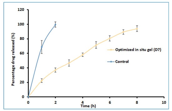 The delivery of drugs from gels is critical for absorption and the resultant therapeutic response. Figure 7 shows a profile of the total amount (%) of darunavir released from D7 and the control. Two distinct release profiles were noticed for the in situ gel and the control. A steady and prolonged drug release was noticed in D7, confirming the feasibility of the developed gel to release the drug in a steady period of 8 h. In contrast, the release was rapid and complete (2 h) in the control formulation. The kinetics of the drug-release data were analyzed for zero-order, first-order, the Higuchi model, and the Korsmeyer–Peppas model. The Korsmeyer–Peppas model has a higher r2 value (0.997), a lower sum of squares of the residuals value (20.47), and a lower Fischer Ratio value (2.92). Hence, the optimized in situ gel formulation followed Korsmeyer–Peppas release kinetics, wherein it was found that the n value (0.7001) was greater than 0.45 (Supplementary Table S2), which indicates that the drug-release mechanism is anomalous [40].