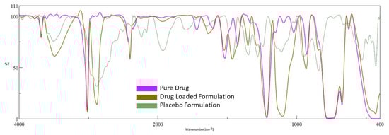 FTIR is used in the preformulation investigations to examine the possible incompatibility of drugs with excipients, as well as to check the stability of the drug in the final gel formulation [41]. The excipients in the formulation may interact with active medicinal substances, causing molecular transformation, and, as a result, affecting the product’s stability [42]. The spectra of the drug, placebo gel, and selected formulation (D7) are presented in Figure 8. Pure darunavir showed absorption bands due to -NH2 (3683.37 cm−1), -C-H stretching (3023.84 cm−1), -N-H stretching (2402.87 cm−1), -C=O stretching (1720.19 cm−1), -C=C stretching (1600.63 cm−1), -C-N bending (1519.63 cm−1), -C=H bending (1427.07 cm−1), -C-O stretching (1214.93, 1095.37, 1022.09 cm−1), and -HC=CH- bending (929.521 cm−1). As shown in Figure 8, in the spectra of the placebo formulation, the main peaks of the polymers are visible. The FTIR spectra of the in situ gel formulation reveal all of the drug and polymer characteristic peaks, with minimal shift because of overlapping excipient peaks. The results confirm the absence of incompatibility between the drug and the other excipients used in the in situ gel formulation.