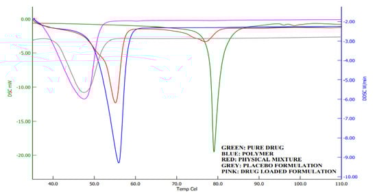 Calorimetry is a method for detecting the thermal behavior of formulation ingredients [30]. The DSC thermogram showed a sharp endothermic peak at 80 °C and 58 °C, which shows the melting points of darunavir [43] and Poloxamer [44], respectively. The DSC of the physical mixture showed two peaks, but with reduced intensity compared to the pure drug and polymer, which may be due to the dilution of the drug with the polymer. However, there was no interaction of the drug and polymer noticed. In thermograms of in situ gel (Figure 9), a single endothermic peak around 45 °C was noticed, which is also noticed in the placebo formulation. This is probably the shift in the Poloxamer melting point that is due to the formation of a gel. No peak of the drug is seen in the formulation around 80 °C, which indicates that there is complete solubilization of the drug inside the in situ gels.