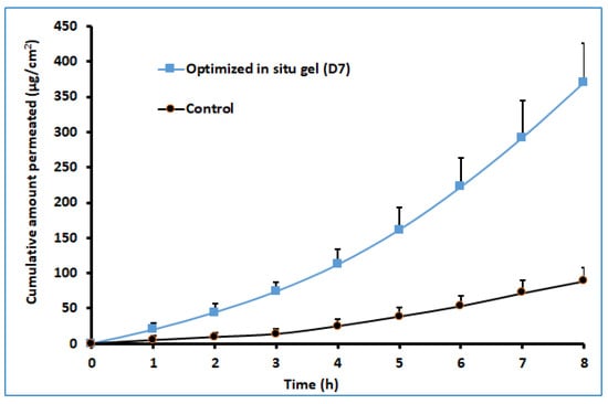 The ex vivo permeation study provides significant insight into the formulation behavior under the in vivo conditions [45]. It is well known that the properties of the therapeutic molecules, as well as the physiology of the biological barriers, regulate drug transport through any membrane. The darunavir permeation from the optimized in situ gel and the control (suspension) was evaluated ex vivo by using sheep nasal mucosa, which has more resemblance to human nasal mucosa [46,47]. The observed permeation of both formulations is depicted in Figure 10. It is apparent from Figure 10 that the drug transport from the in situ gel is significantly higher (p < 0.005) than in the control. The greater drug permeation (cumulative amount permeated in 8 h was ~370.17 µg/cm2) noticed with the gel formulation could be related to the higher drug solubility. Being a BCS class II drug, an increase in the solubility of this drug is likely to provide higher permeability across the nasal membrane. A higher steady-state flux (~49.83 µg/cm2/h) and permeability coefficient (1.25 × 10−2 cm/h) were observed with the gel formulation in comparison to the control (flux: ~49.83 µg/cm2/h, and permeability coefficient: ~3.08 × 10−3). However, the lag time for both formulations was comparable (1.25 and 1.39 h for in situ gel and control, respectively). The results of this study signify that the optimized in situ gel formulation could potentially augment the nasal delivery of darunavir.