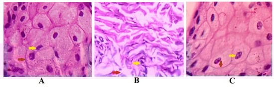 Histopathological examination of sections of sheep nasal mucosal membrane. (A) Negative control: hematoxylin and eosin staining of nasal mucosa membrane applied with phosphate buffer reveal unaffected nasal cells with intact basement membranes (red arrows), as well as undamaged glandular cells with clear nuclei (yellow arrow). (B) Positive control: nasal mucosa treated with isopropyl alcohol suffered severe cellular and histological damage. The treatment with isopropyl alcohol disrupted basement membrane (yellow arrow) and loss of nucleus of glandular cells to form a multinucleated cells. (C) Test: nasal in situ gel of darunavir when exposed to nasal tissues of the sheep showed intact basement membrane (red arrow) and normal arrangement of the glandular cells with well-defined nuclei (yellow arrow), indicating no signs of toxicity of the formulation.
