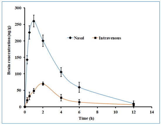 The brain drug concentration–time profile of darunavir after administration by nasal (optimized in situ gel, 30 µL, 2.4 mg/kg) and intravenous (solution, 0.4 mL, 2.4 mg/kg) routes in rats. The data presented are the average of six animals at every time point.